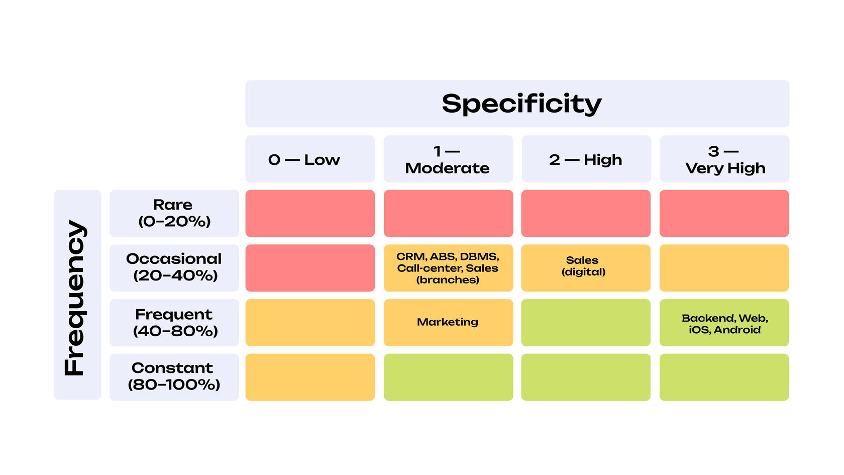 В продвинутой Heat Map частотность дополняется вторым измерением — specificity, заимствованным из теории транзакционных издержек. Специфичность отражает степень зависимости функции от уникального продуктового контекста, доменной экспертизы и архитектуры. В логике TCE высокоспецифичные функции целесообразно удерживать внутри юнита, поскольку их вынесение за пределы продуктовой группы приводит к росту транзакционных издержек — издержек координации, согласований и адаптации. Низкоспецифичные функции, напротив, могут быть централизованы без существенных экономических потерь.