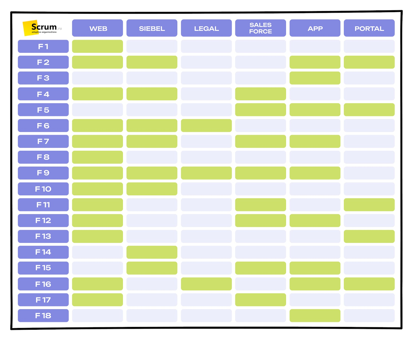 Базовая Heat Map представляет собой таблицу, где строки — элементы Бэклога Продукта, а столбцы — архитектурные компоненты и функции; ячейки помечаются, если для реализации конкретной фичи используется соответствующий компонент. Подсчет таких «зажженных» ячеек по столбцам показывает, какие компоненты и технологии используются чаще всего и должны быть представлены в составе продуктовых команд, чтобы они могли забирать широкий спектр работ из Бэклога Продукта.