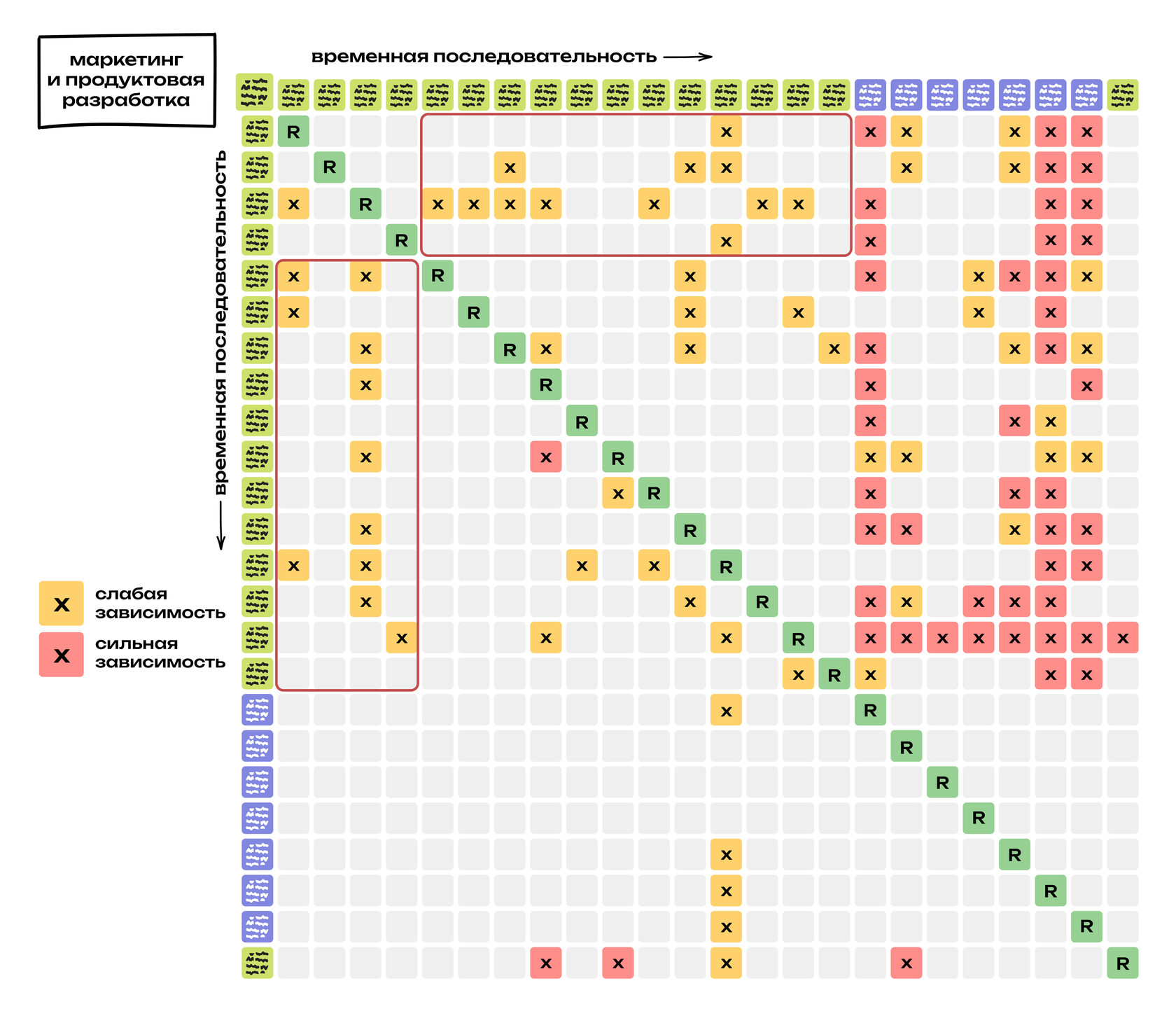 С другой стороны, только по частотности может казаться, что функция обязательна (например, маркетинг). Но если DSM-матрица показывает лишь общие или последовательные зависимости, а критичность и неопределённость низкие — маркетинг вполне можно оставить за пределами продуктовой группы.
