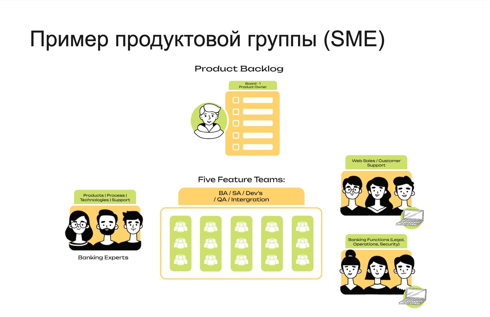 Пример продуктовой группы: в Jusan Bank была создана мощная продуктовая группа, сфокусированная на сегменте малого и среднего бизнеса (SME). В неё входило около 250 человек. Группа охватывала всё: от открытия счета до кредитования и бухгалтерии. Аналогичную, но меньшую по масштабу группу (~120 человек) я встречал и в Альфа-Банке (Киев). Группа включала в себя продуктовую разработку, маркетинг, продажи, операции, юристов, ИБ — всё для максимальной автономности и фокуса на клиенте.
