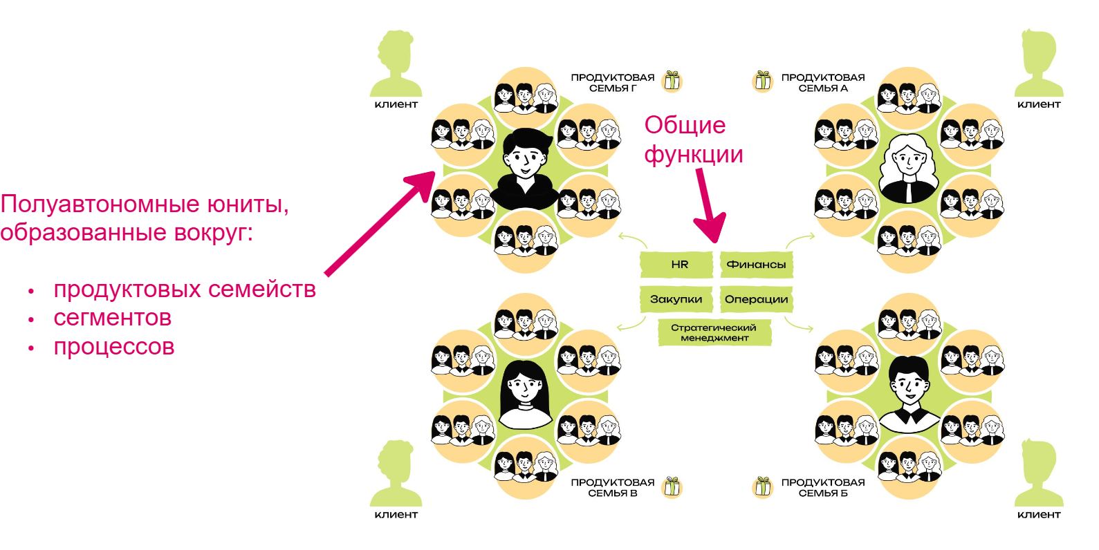 Как видно, одна и та же идея — продуктовая группа — воплощается по-разному в зависимости от выбранного стратегического фокуса. Именно поэтому так важно вначале определить свой фокус, прежде чем браться за редизайн структуры и процессов.